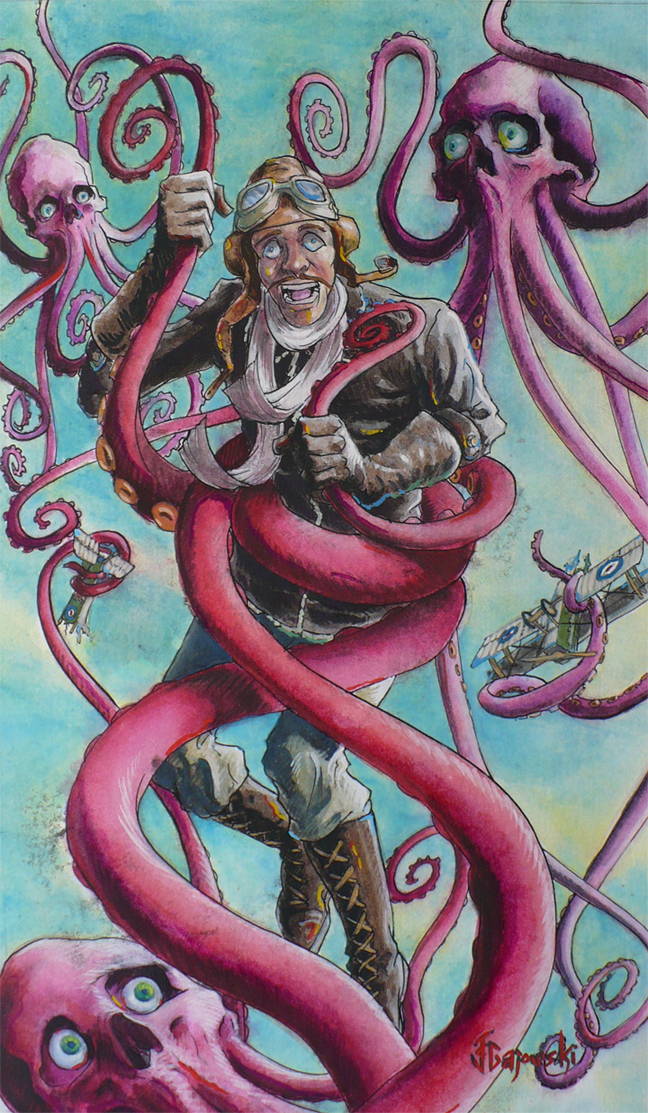 octopus, world war one, ww1, wwi, WWI, pilot, monster, biplane, war, dog fight, fucked, enemies, friends, animals, tentacles, battle, godzilla, gamera, comics, pencils, inks, gouache, watercolor,